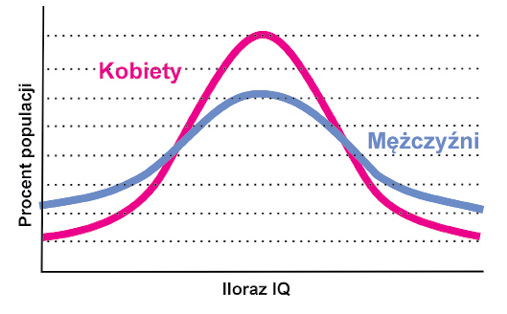 Wykres przedstawiający różnice między kobietami i mężczyznami, uznawany w debatach za poprawny, ilustruje następujące prawidłowości: średnie IQ kobiet i mężczyzn jest takie samo. Wartości IQ u mężczyzn mają większy rozrzut: mniej jest osobników średnich, ale za to jest wśród nich więcej geniuszy… i osób upośledzonych umysłowo. Twierdzeniem kontrowersyjnym, ale jak najbardziej zgodnym z obserwowalnymi faktami, jest to, że więcej jest mężczyzn geniuszy niż kobiet. Innym błędem poznawczym, który popełniają uczestnicy debat hierarchicznych w wojnie „o dominację”, jest koncepcyjne nierozumienie pojęcia per capita. W wykresie powyżej uśrednione IQ dla mężczyzny i kobiety będzie praktycznie identyczne. Nie tylko IQ podlega prawidłowościom rozkładu normalnego. Wybierając z mieszanej populacji grupę np. 5 osób najbardziej agresywnych czy pięciu najwybitniejszych geniuszy, w przypadku typowym otrzyma się pięciu mężczyzn i zero kobiet. Tak działa statystyka.