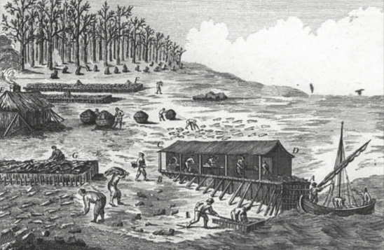 W sezonie letnim plaże Nowej Fundlandii zmieniały się w fabryki na świeżym powietrzu. Całodzienna harówka sprawiała, że skórzane fartuchy pracujących mężczyzn pokryte były łuskami ryb i krwią. Rybami śmierdziało wszędzie i cały czas. Już na początku wypracowano rodzaj linii produkcyjnej, w której każda ryba przechodziła przez szereg rąk. Ale sumaryczna skala ich działalności była prawdziwie przemysłowa – łowiono setki i tysiące ton ryb, które patroszono, solono i suszono.